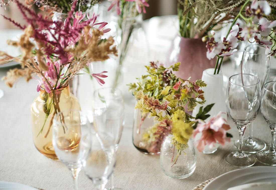 装花やクロスに至るまでプロがコーディネート。おふたりらしさを大切に、館内すべてを美しく彩ります。