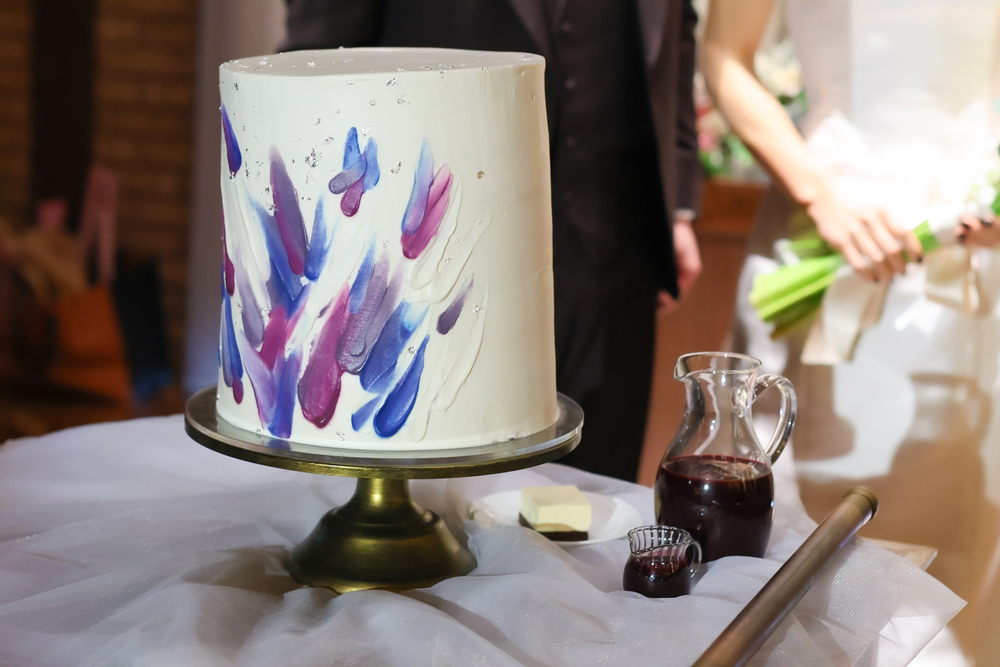 ウェディングケーキイベントでは、友人が届けてくださったウェディングケーキにご入刀♪そしてりょうへいさんのファーストバイトではりょうへいさんがお好きなチーズケーキが登場し、ソースをかけて完成&幸せいっぱいのファーストバイトを行いました。