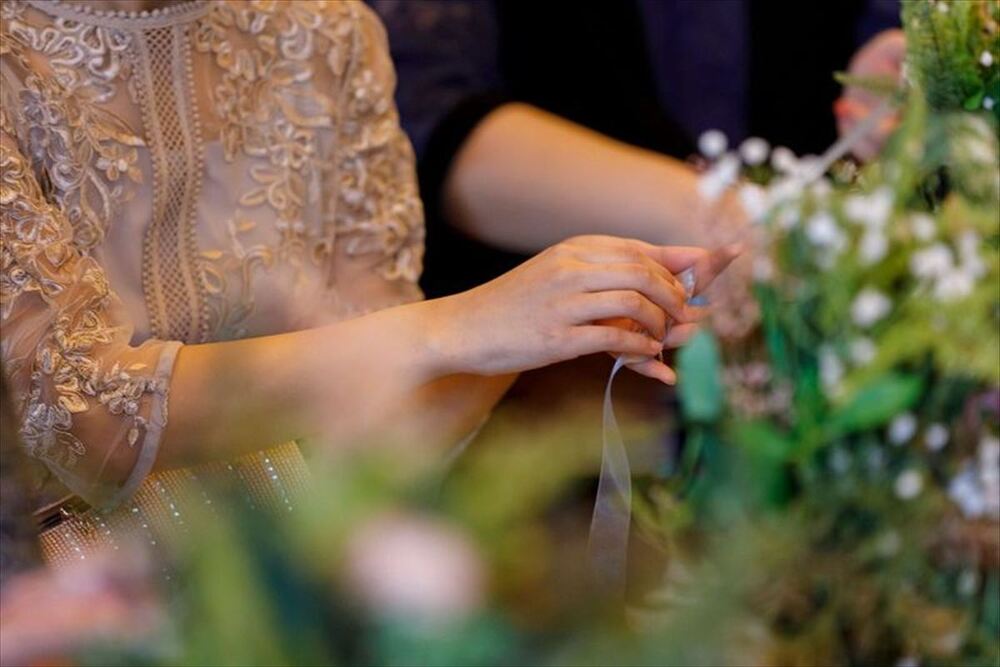 まなみさんの運命の一着はB.DRESSERで選ばれた【Temperley London】のウエディングドレス。全体に施されたワイルドフラワーやリボンのデザインが可憐で愛らしい印象を与えてくれます。