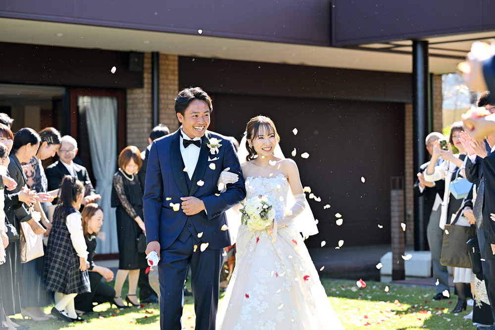 フラワーシャワーで皆様に祝福していただいた後は、りほさんから女性ゲストの皆様へ幸せのお裾分け『ブーケトス』を行い、ろくろうさんからも男性ゲストの皆様に、ビールジョッキ型のボックスに入ったおつまみセットをトスされました!とても盛り上がる演出になりました!