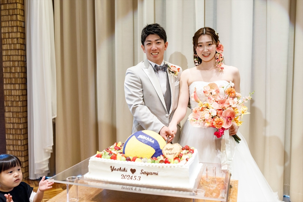 ケーキセレモニーでは、ふたりの共通点であるバレーボールをのせたケーキを作っていただきました!ボールは実際のサイズと同じ質感で再現度が高く、ゲストの皆様も大変盛り上がりました。